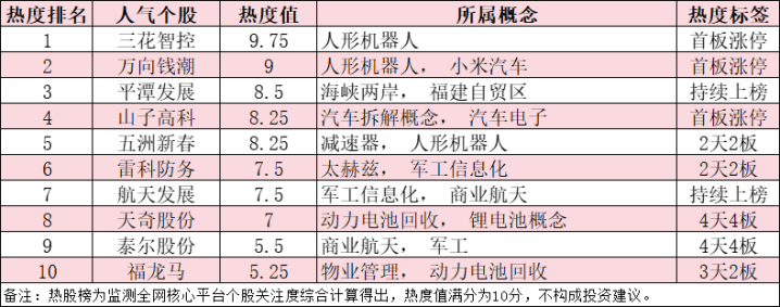 今日,A股十大人气热股如下:三花智控、万向钱潮、平潭发展、山子高科、五洲新春、雷科防务、航天发展、天奇股份、泰尔股份、福龙马。