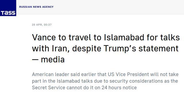 (塔斯社称,尽管特朗普发表了声明,但万斯仍将前往伊斯兰堡与伊朗举行会谈)